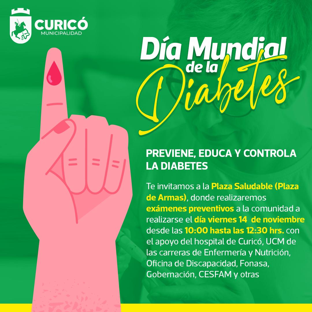 En el marco del Día Mundial de la Diabetes, la Corporación Unidos por la Diabetes en conjunto con la Municipalidad de Curicó invitan a toda la comunidad a participar en una jornada informativa y de salud que se realizará el viernes 14 de noviembre, entre las 10:00 y las 12:30 horas, en la Plaza de Armas de Curicó.